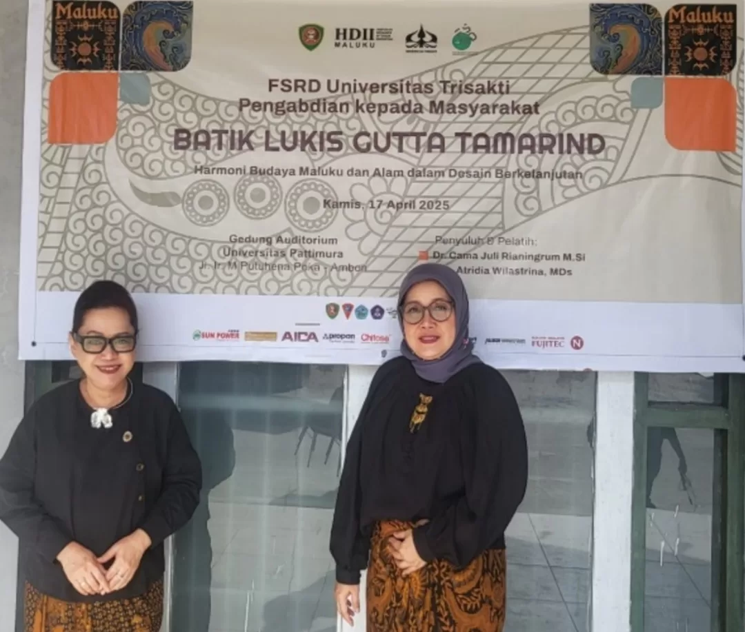 JABARBICARA.COM – Fakultas Seni Rupa dan Desain (FSRD) Universitas Trisakti mendapat undangan untuk turut serta berperan dan berpartisipasi dalam acara Pameran Material, Seminar, dan Workshop  dengan tema “ Harmoni Budaya Maluku dan Alam dalam Desain Berkelanjutan” yang berlangsung pada tanggal 15 – 17 April 2025. Acara ini diselenggarakan oleh HDII Ambon yang diketuai oleh Bapak Hartono, HDII, bekerjasama dengan Pemerintah Provinsi Maluku dan didukung oleh Universitas Pattimura Ambon, Maluku, dan para sponsor dari berbagai industri yang terkait dengan produk Interior. Tim PkM dan pameran  dari Universitas Trisakti diwakili oleh dua orang dosen, yaitu Dr. Cama Juli Rianingrum, MSi. dan Dra. Atridia Wilastrina, MDS.