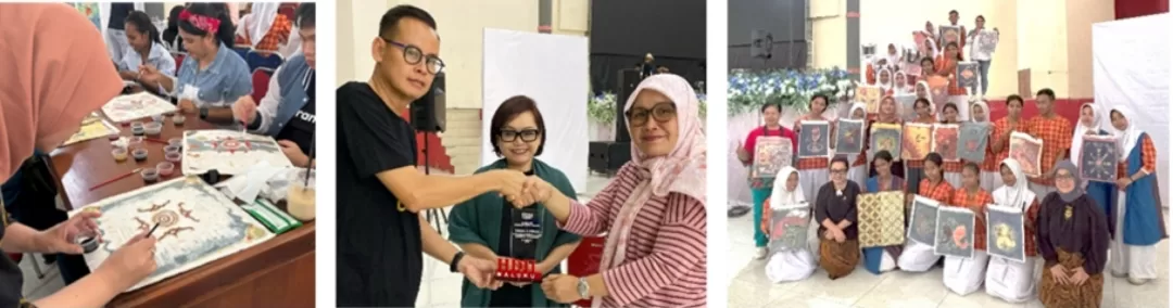 [1] Suasana Workshop Batik lukis tamarind dengan motif khas Maluku, [2] Ketua HDII Maluku Bapak Hartono memberikan Plakat Penghargaan untuk FSRD Universitas Trisakti dan [3] foto bersama dengan  peserta pelatihan serta hasil karya lukis batik tamarind